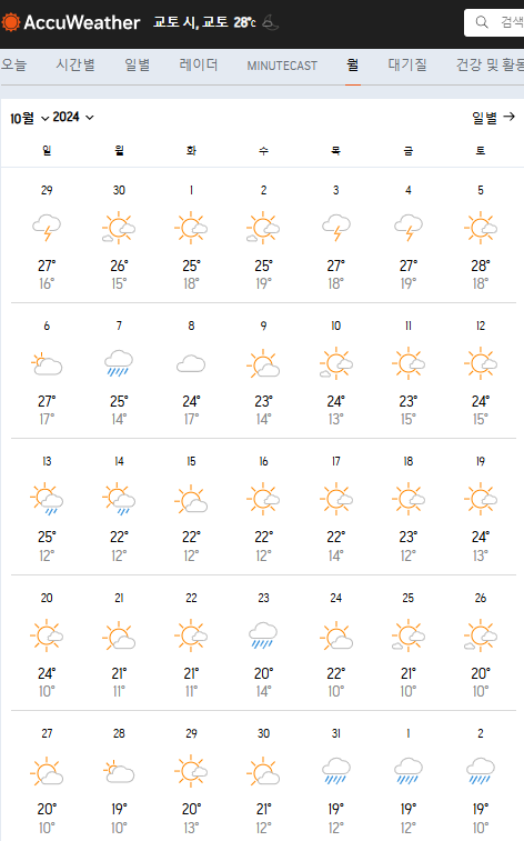 [2] 교토와 오키나와, 도쿄, 치바, 요코하마, 나고야의 10월 날씨 정보를 확인해 보시기 바랍니다.